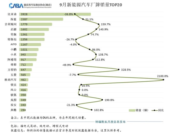 重庆新能源汽车厂牌销量TOP20前三依然是比亚迪、深蓝、吉利银河,销量分别为3928辆、2387辆、1779辆。