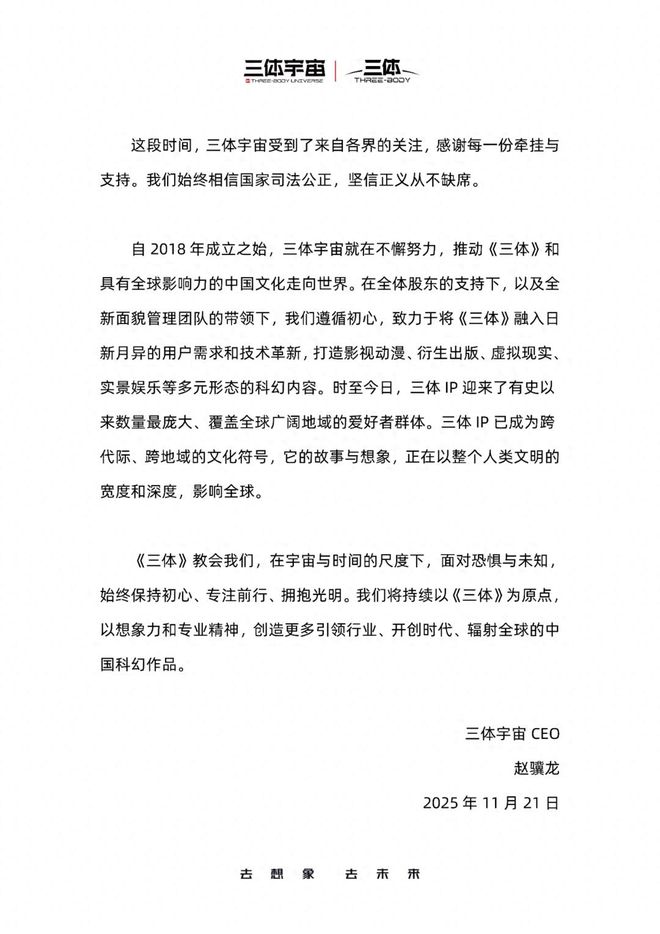 11月21日,三体宇宙CEO赵骥龙发布公开声明,感谢近段时期社会各界对三体宇宙的牵挂与支持,并表示:“我们始终相信国家司法公正,坚信正义从不缺席。”