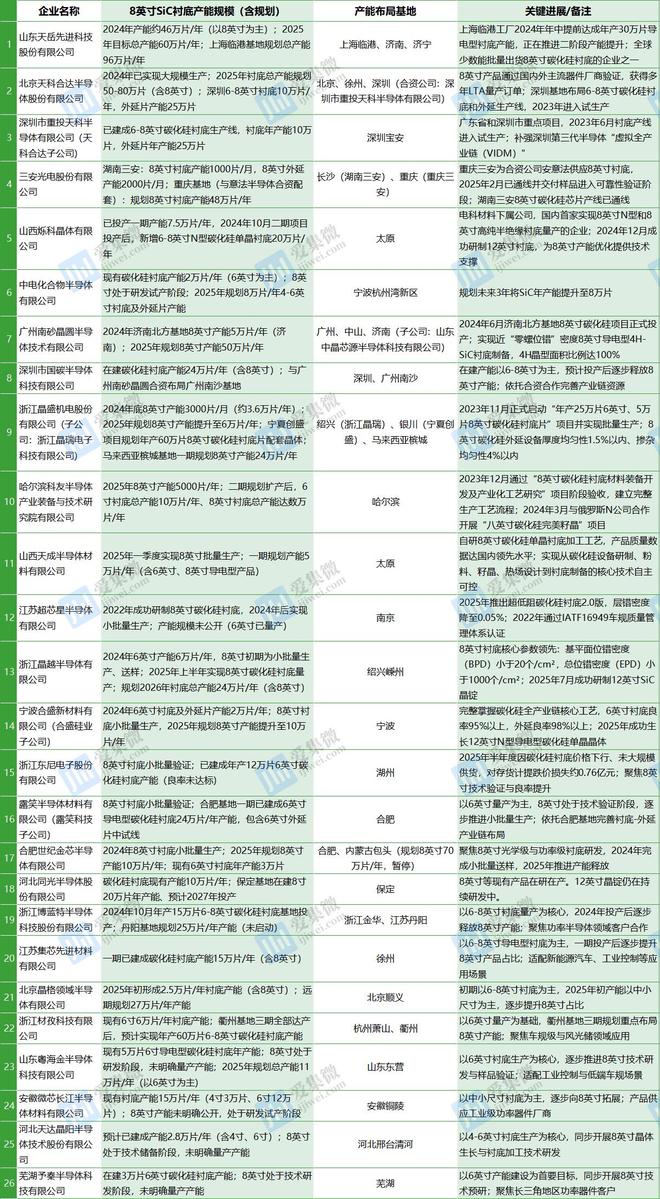 26家本土企业8英寸SiC衬底推进情况(半导体信息及公开资料整理)