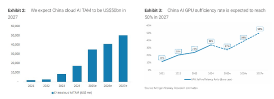 在外部供应方面,摩根士丹利注意到,中国市场的AI算力需求呈现“训练偏紧、推理拓展”的分层格局。报告认为,部分新品类AI加速器由于定价、能效或生态适配度等因素,未能在中国市场形成强劲的放量动力,从而为本土方案释放出更多窗口期。