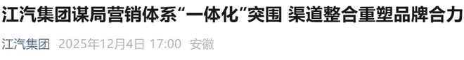 电动知家消息,12月9日,据多家媒体及江淮集团此前报道,江汽汽车集团正式启动乘用车业务板块的营销渠道整合。此次整合涉及乘用车、新能源乘用车及皮卡三大业务板块,旨在打通内部资源壁垒,激发“江淮瑞风”“江淮钇钇为”“江淮悍途”三大品牌势能。