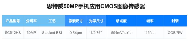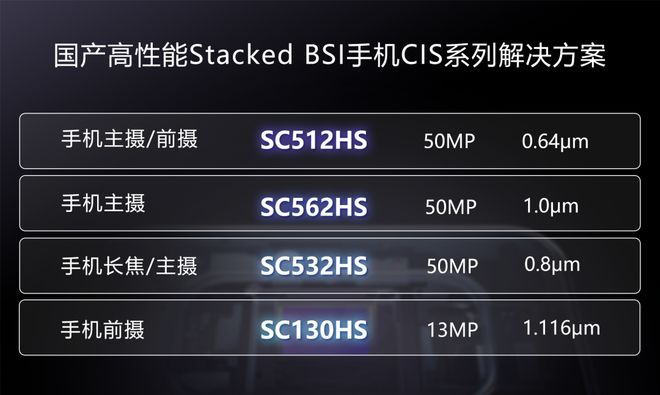 作为思特威国产高性能 Stacked BSl 系列化的又一拓展新品,SC512HS 兼顾了性能与成本优势,可与思特威已发布的同系列手机 CIS 产品 SC562HS、SC532HS 及 SC130HS 组成手机摄像头 CIS 全套解决方案,为国产手机 CIS 本土化供应提供多样化选择。