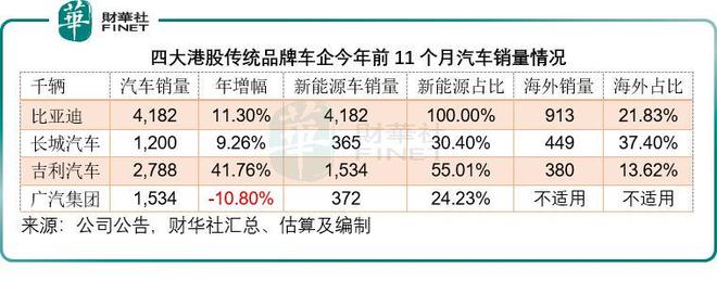 今年前11个月,比亚迪的汽车销量稳居前列,其中新能源汽车销量进一步巩固领先优势,与此同时,吉利汽车的增长十分显著,新能源汽车占比已达55.01%,产品布局合理。从海外表现来看,长城汽车保持优势,而比亚迪、吉利、广汽也在发力海外市场,且拥有较大的发展空间,见下表。