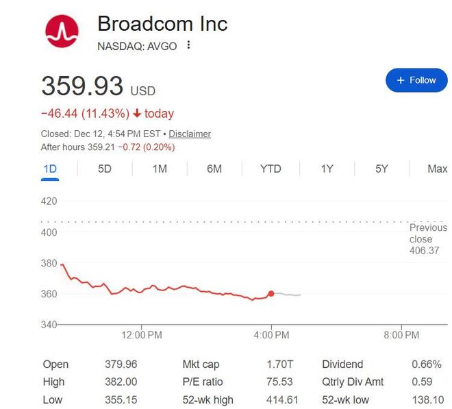 周五,博通股价刷新日低时盘中跌近12%,创10个月来最大跌幅,尽管公司刚刚公布了强劲的第四财季业绩。这家与英伟达竞争AI芯片大厂周四盘后发布的财报显示,第四财季营收达180亿美元,调整后每股收益1.95美元,均超过分析师预期,分别同比大增近30%和近40%。