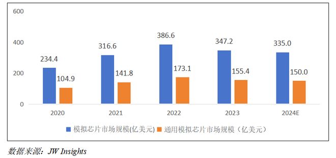 中国一直以来都是全球最主要的模拟芯片市场,尤其实在新能源汽车、算力中心等热点应用领域快速发展带动下,中国模拟芯片市场增长超过全球平均水平。JW Insights预计2024年中国模拟芯片市场规模约为2380亿元人民币,约合335亿美元(2024年美元兑人民币汇率按1:7.12计),全球占比约为42%。