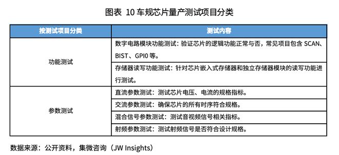 当车规芯片通过车规认证标准进入大批量生产阶段,所涉及到的检测环节主要分为CP测试、FT测试、SLT测试。测试内容可以主要分为功能测试、参数测试、可靠性测试。通过对芯片产品的电压、电流、时间、温度、电阻、电容、频率、脉宽、占空比等参数的专业测试,才能够验证芯片是否符合设计的各项参数指标,确认在晶圆制造和芯片封装的过程中是否存在瑕疵。