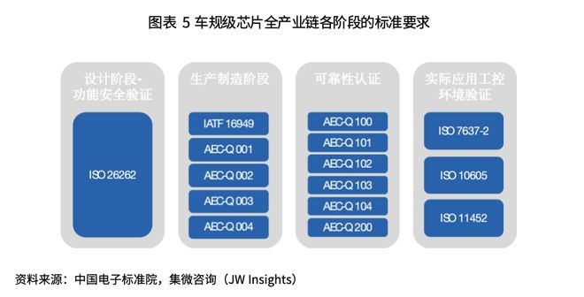 车规芯片在真正投入量产前,需要经历0-1的车规芯片新品迭代认证环节,即需要经过一系列严格的测试验证,以保证产品的可靠性,达到车规要求。目前,业界常用的芯片车规认证标准有可靠性标准AEC-Q系列、功能安全标准ISO 26262、质量管理体系认证IATF16949等。