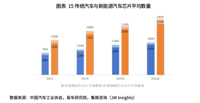 目前,汽车芯片的需求量正在急剧上升,近五年期间整车芯片数量呈现翻倍式增长。随着汽车智能化和网联化的发展,计算芯片、安全芯片、无线通信芯片、存储芯片、传感器数量在持续增加。据中汽协以及易车研究院统计,2022年中国传统燃油车单车芯片数量为900-950颗,新能源汽车单车芯片数量为1400到1500颗,2024年传统燃油车单车芯片数量来到1000-1100颗,新能源单车芯片平均数量来到1700-1900颗。根据集微咨询测算,2025至2026年,传统燃油车单车芯片数量达到1200-1400颗,新能源汽车单车芯片数量达到2000-2400颗。