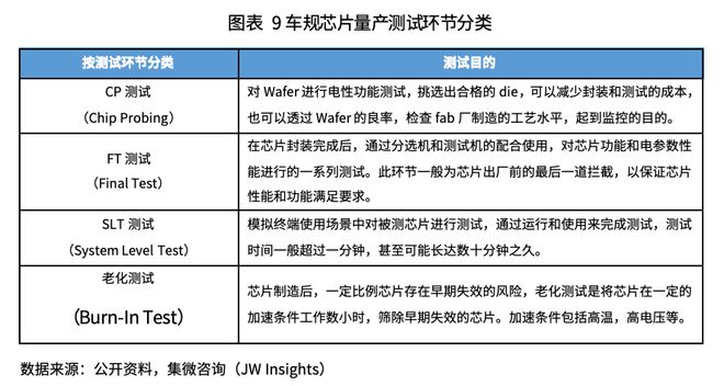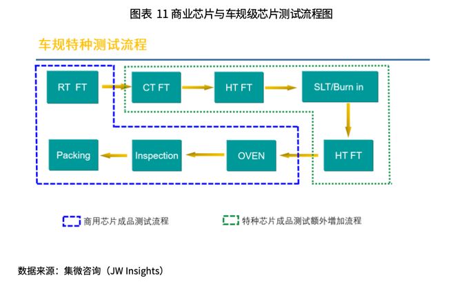 与消费级和工业级芯片应用相比,车规级芯片应用对环境要求、抗振动冲击、可靠性、一致性、寿命等方面的要求更为严苛,因此车规测试项目复杂度更高、测试条件更严苛、测试时间更长。具体体现在:在成品测试阶段,与非车规芯片成品测试流程相比,车规级芯片成品测试需要经过严格的三温测试(RT FT,CT FT,HT FT)、老化测试(Burn in)、SLT测试等环节,而非车规芯片仅需要常温测试,无需高低温测试。因此车规级芯片测试的测试时长和成本也均相应增加。
