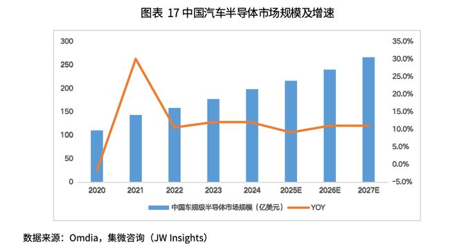 过去几年中国汽车产业高速发展,相较于全球市场,我国汽车产业电动化升级处于全球领先位置,2022年我国新能源汽车渗透率达到25.6%,已大幅领先美国和欧洲电动车渗透率水平。我国作为汽车生产大国,对汽车半导体需求同样旺盛,同时伴随着汽车电动化、智能化的不断升级,中国汽车半导体市场有望快速扩容。据Omdia统计测算,2025年中国汽车半导体市场规模约为216亿美元,同比增长11.5%,据集微咨询预测,预计到2027年将达到266亿美元。
