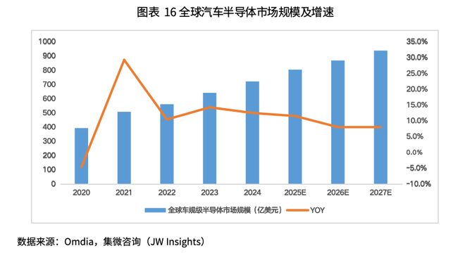 尽管近几年全球汽车产量放缓,但受益于全球各国对清洁能源的需求,新能源汽车在2021-2022年期间迎来高速发展,带动汽车半导体市场迅猛增长,迎来缺芯潮。但经历这波缺芯潮后因车企过度备货,2023年后进入去库存周期,增速放缓。据Omdia统计测算,2024年全球汽车半导体市场规模达721亿美元,同比增长12.5%,预计2027年全球汽车半导体市场规模有望增长至938亿美元,CAGR(2024-2027)达9%。