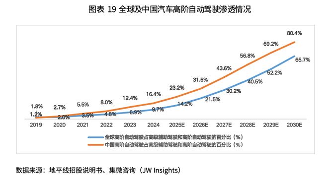 智能化方面,全球汽车产业正从以高级辅助驾驶(ADAS)为主向更高阶的自动驾驶与智能座舱深度融合阶段演进。目前,L2/L2+ 级辅助驾驶已成为全球主流新车的重要配置,高算力芯片、感知融合与软件定义汽车(SDV)正在推动汽车智能化加速渗透。预计到 2030 年,全球范围内具备高阶自动驾驶能力的车型渗透率将显著提升,但整体推进节奏仍受法规、安全责任认定及区域技术成熟度差异影响。中国汽车智能化进程加速,2025年高阶自动驾驶在高级辅助驾驶和高阶自动驾驶中的占比为23.2%,预计2030年将上升至80.4%,显著高于全球平均水平。