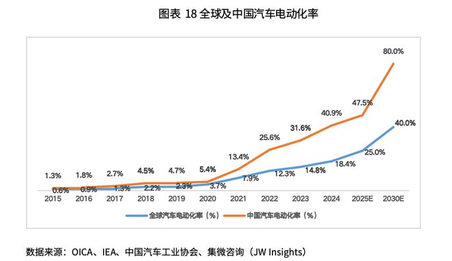 从全球范围看,汽车电动化已进入加速普及阶段。根据国际能源署(IEA)数据,2025 年全球新能源汽车(含纯电和插混)新车销量占比已提升至约 25%,预计到 2030 年全球电动车销售占比近 40%。中国是全球汽车电动化进程中最领先、最具影响力的市场,2025 年中国新能源汽车销量占新车市场比重已接近50%,显著高于全球平均水平。在政策持续支持、产业链成熟、成本下降及充换电基础设施完善的共同推动下,中国汽车市场电动化率仍将进一步提升,预计 2030年电动化率有望达到80%。