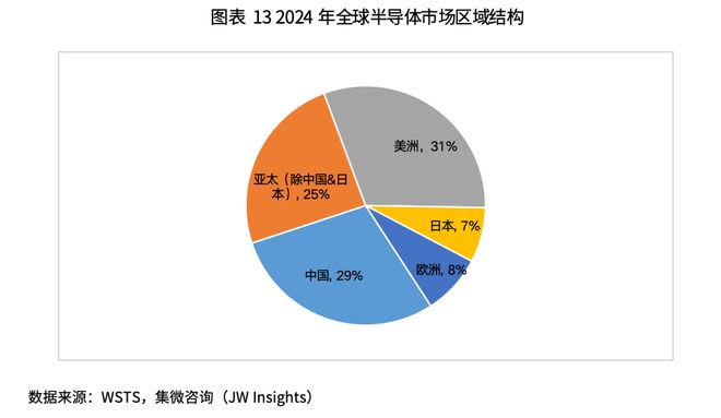 目前,中国是全球第一大消费电子生产和消费国,也正处于新一轮科技革命、产业变革和产业链、供应链水平提升的关键时期,对半导体产品的需求逐年提升。自2022年以来,中国市场份额始终占据全球约三分之一,2024年中国半导体市场销售额约为1834亿美元,继续维持份额。北美市场因为AI发展的强劲需求,在2024年增长44%,领先其他区域增速,份额提升。