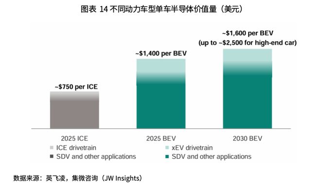 根据英飞凌最新数据统计,2025年纯电动车的单车芯片价值量有了更大的提升。2025年,BEV单车半导体价值量约为ICE的1.87倍,增长驱动主要来自电动化和智能化的快速增长和渗透,比如SIC功率器件、BMS电池管理系统,据英飞凌预估,2030年高端BEV汽车半导体单车价值量可达2500美元,主要受ADAS、中央计算平台和软件定义汽车这一趋势推动。