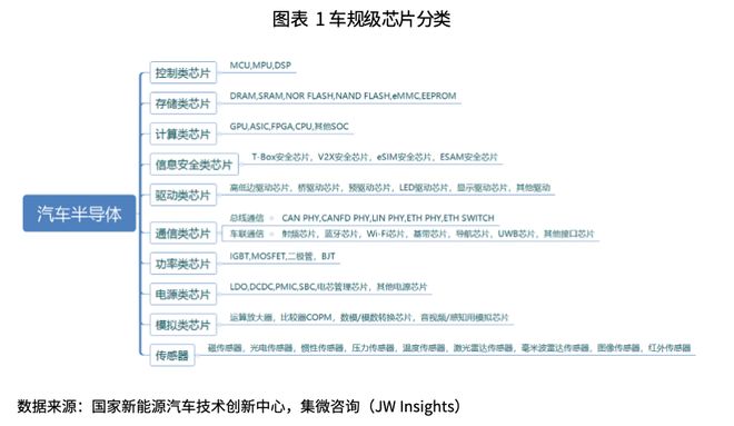 而实际应用过程中,汽车中应用的电子元器件除了车规级芯片,也有功率、传感等器件,统称为汽车半导体。根据下游应用场景划分,汽车半导体可以分为10个大类和60个小类,10个大类分别包括控制芯片、存储芯片、计算芯片、信息安全芯片、驱动芯片、通信芯片、功率芯片、电源芯片、模拟芯片以及传感器。