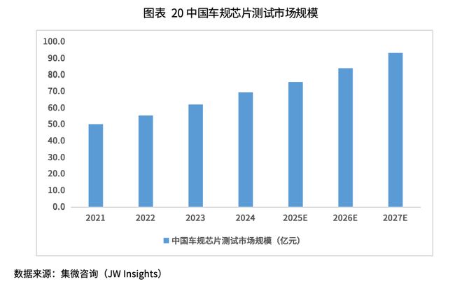 随着越来越多芯片设计企业加速布局车规级芯片,汽车芯片设计企业产能需求的攀升亦带动了我国晶圆代工厂在汽车产品上的投入力度,中芯国际、华虹等本土晶圆厂均完成车规认证并逐步提升产能。汽车芯片设计公司数量及产值的快速增长,叠加本土晶圆厂车规产品线的投入增加,使得车规级芯片测试的市场需求随之增长。据集微咨询测算,预计2025年国内车规芯片测试市场规模为75.6亿元,2027年将达到93.1亿元。