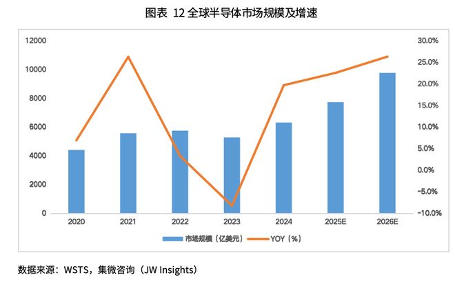 继2021年全球半导体市场强劲增长26.2%之后,因为通胀上升和终端市场需求疲软的影响,2022年下半年全球半导体市场正式进入衰退,根据WSTS统计,2022年全球半导体市场规模增长放缓至3.3%,总规模达5741亿美元。受益于人工智能、数据中心、汽车电子、机器人和工业等领域的需求驱动,全球半导体市场在经历短期低迷后,于2024年开始持续复苏并快速增长,其中存储器和逻辑芯片增长尤为显著。