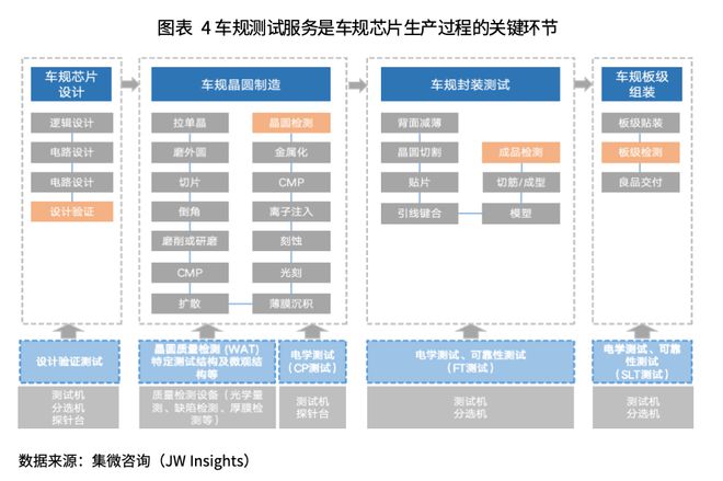 车规级芯片的全生命周期包括从车规芯片设计、车规制造、车规封装、车规测试、应用到最终的报废和回收利用。车规测试则贯穿车规级芯片全生命周期流程中,在IC生产链条中承担着设计验证、检验筛选和质量控制的重要责任。在芯片设计阶段,测试环节涉及可测性设计和设计验证测试;在晶圆制造阶段,主要体现为晶圆检测;在封装阶段,成品测试是其中的关键节点;板级组装阶段,主要体现为系统级测试,除此之外还包含了特征化测试、可靠性测试、质量保证测试等工序。