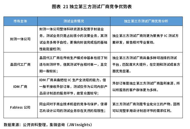 独立第三方测试服务厂商在技术专业性和效率上的优势更明显,同时出具的报告结果中立且客观。相比之下,封测一体厂商的核心业务是封装,配套进行芯片测试,业务占比较小,如2024年日月光测试服务业务占比9%,安靠测试服务业务占比约15%。而第三方测试厂商专注于晶圆测试及芯片成品测试环节,台湾京元电子测试业务占比超80%,大陆第三方测试企业测试业务占比超90%,在专业性、灵活性以及独立性方面竞争优势更为突出。