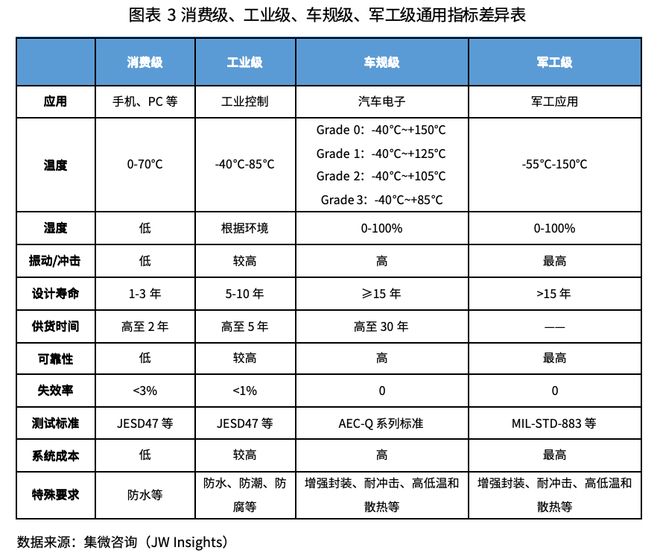 芯片根据应用领域,通常可以分为消费级、工业级、车规级和军工级四个等级,这些领域对环境条件、可靠性、耐久性等指标的标准不同,按照从高到低的要求排列,依次为:军工>车规>工业>消费。