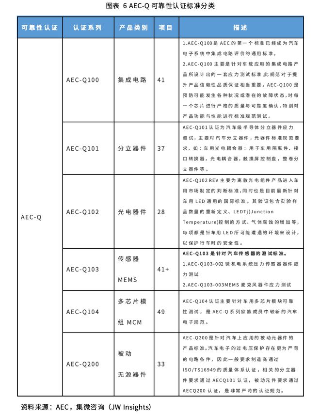 AEC-Q系列认证是芯片车规认证可靠性标准。主要包括AEC-Q100(集成电路IC)、AEC-Q101(半导体分立器件)、AEC-Q102(光电器件)、AEC-Q103(MEMS压力器件)、AEC-Q104(多芯片模组MCM)、AEC-Q200(无源器件)。AEC-Q系列认证不是强制性的认证制度,但经过了30年的发展,目前已成为公认的车规元器件的通用测试标准。