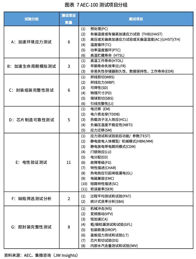 AEC-Q100一般称为“集成电路的应力测试标准”,该标准规范了7大类别共41项的测试,整个认证的测试项目涵盖了温度、湿度、机械冲击、振动、EMC,ESD,电迁移、应力迁移、热载流子注入、闩锁效应、芯片剪切等方面的试验。这些测试项目并不是适用于所有IC,需要根据IC的种类进行适配性的测试,也需要根据芯片的温度等级来进行测试条件的修改。根据DUT,至少有28项实验是必须要做的,否则不能声称物料通过了AEC-Q100认证。