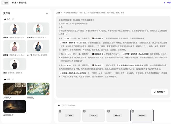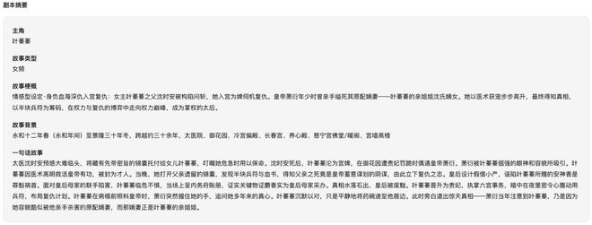 例如,只需向小云雀短剧Agent上传一部大女主宫斗剧本,它便能基于剧本研读完成导演的前期案头工作:首先,通过深度理解剧本,自动生成故事梗概,清晰呈现女主入宫缘由及入宫屡次遭遇暗算并化解的经历,以及女主的心理状态。接着,智能划分剧集结构,并在每集内完成分场。同时,基于对剧本的深入理解,它会自动深入理解每一位角色的性格及每一场戏的氛围,为后续角色形象设计、分镜设计、配音等所有环节提供一份精确、统一的参考。
