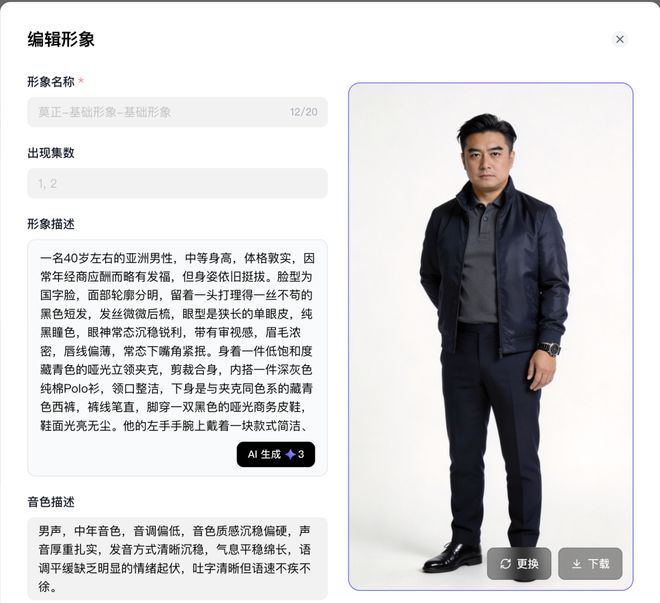 如输入一份三兄弟争夺遗产的剧本,故事时间设定在2016年,剧中大哥一角早年靠做生意白手起家,磨炼出其稳重的性格,城府深沉。小云雀短剧Agent在设计形象时,通过“体格敦实”“略有发福”展现其中年年龄,以及常年经商应酬的特征,“一丝不苟的黑色短发”“狭长的单眼皮,眼神常态沉稳锐利”“藏青色哑光立领夹克、深灰色纯棉Polo衫”,展示其自律、严谨利落、沉稳低调的性格及气质,通过“佩戴款式简洁的哑光精钢手表”展示其时间观念及社会经济地位。值得注意的是,该形象生成后,用户可新建角色,也可在此基础上进行人工调整与细化。