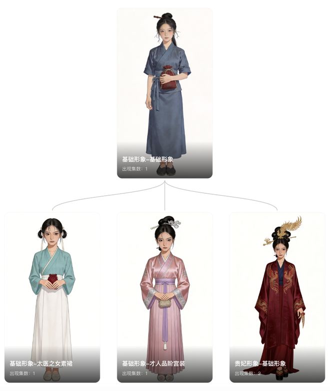 首先是身份连续性的识别,如在一本以叶蓁蓁为大女主的宫斗剧中,当剧本中出现“叶姓婢女”“叶才人”“叶太后”等不同称谓时,小云雀短剧Agent不会将其视为不同角色。它能通过上下文分析,自动将这些身份标签关联到同一个核心角色实体。其次,叶蓁蓁从清丽到威仪再到沧桑的转变,小云雀短剧Agent会锚定同一面部形象,根据对角色境遇的理解,对服饰、妆容、神态等进行改变。不止主角,在整个故事跨度中,每个角色的年龄、身体状态的变化,小云雀短剧Agent能持续追踪并更新,如中年时期的皇帝和老年病重的皇帝等。