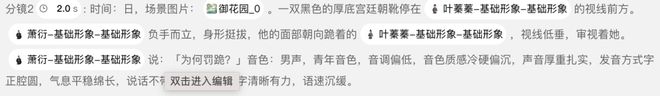 在分镜生成环节,小云雀短剧Agent可基于对剧本世界观的深度理解,自动生成完整细致的分镜描述。它的分镜设计既包含场景样貌、布景细节、光影等场景构建,还包括场景过渡、道具位置等画面设计,也细化了人物在场景中的站位、服饰、面部朝向、动作、表情、眼神、氛围、音色等表演细节,同时明确单镜头运镜时长,以及多镜头间的转场方式,而且以上这些要素也皆可人工进行调整。