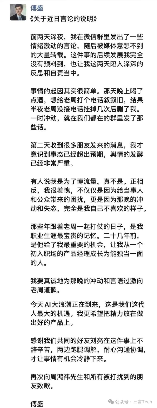 傅盛解释称,那天晚上喝了点酒,想给周鸿祎打个电话叙叙旧,结果半夜老周没接电话挂掉几次后删了好友。一时冲动,就在双方都在的群里发了那些话。