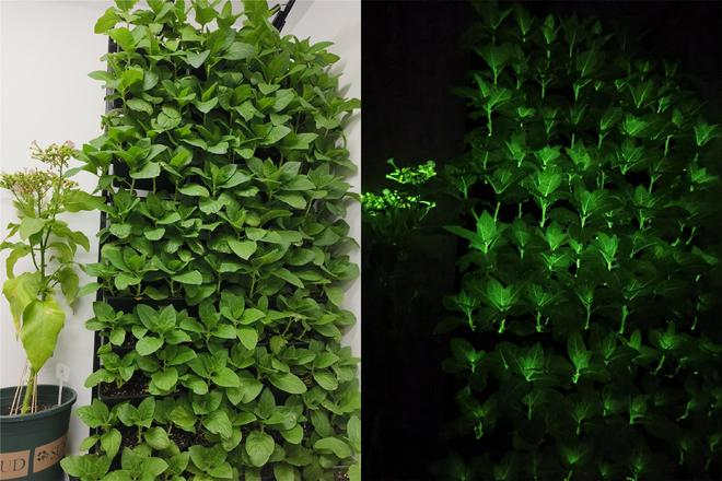 左为开灯状态下的发光植物,右为黑暗环境下用夜景模式拍摄的发光植物