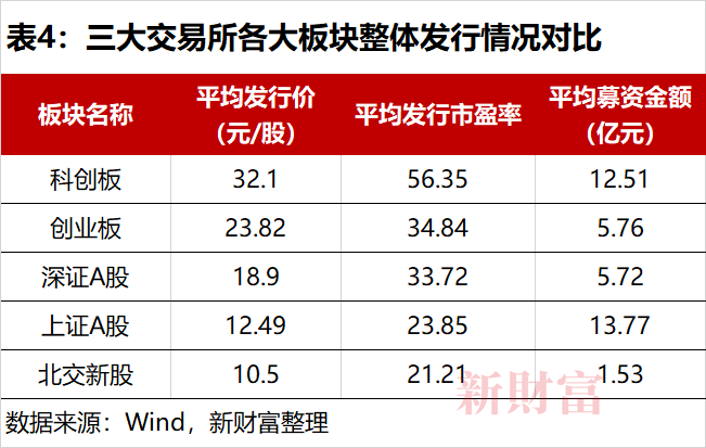 科创板平均发行市盈率则高达56.35倍,平均发行价32.1元,平均募资12.51亿元。创业板平均发行市盈率34.84倍,平均发行价23.82元,平均募资5.76亿元(表4)。