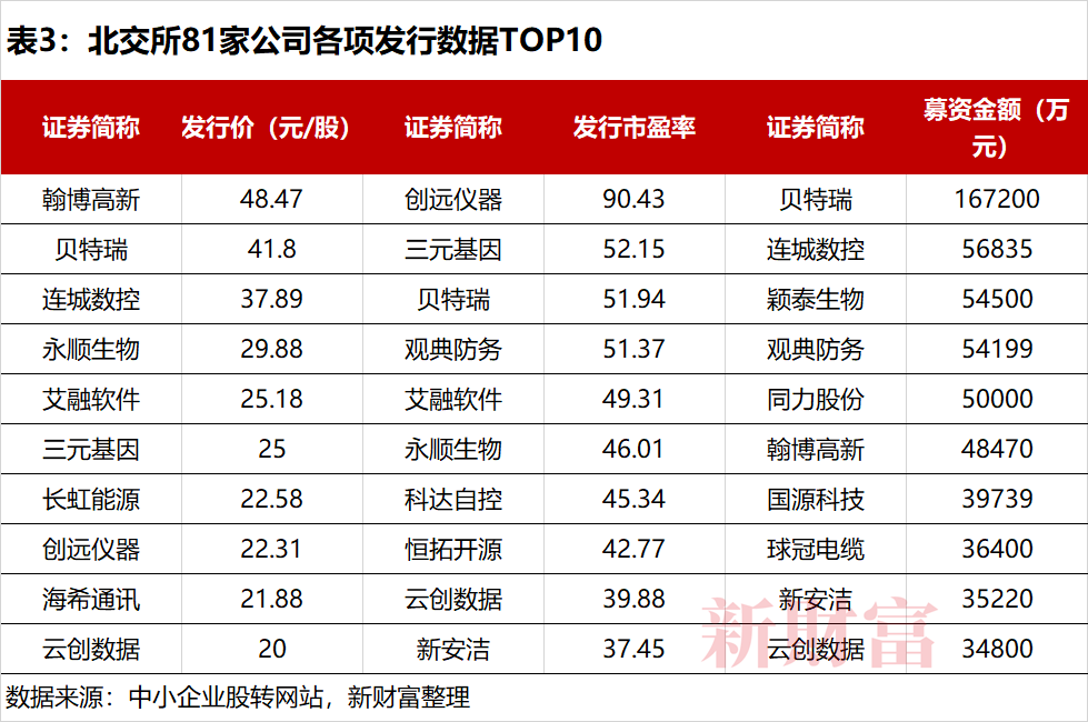 将范围扩大到全部北交所公司,发行价格、发行市盈率和募资金额都居前10家的企业,只有两家,即贝特瑞(835185)和云创数据(835305),如表3。