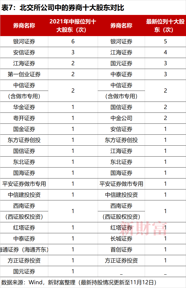 新财富此前统计显示,截至2021年中报,银河证券是6家北交所公司前十大股东,在三季度,银河证券悄然减持多家公司(表8)。