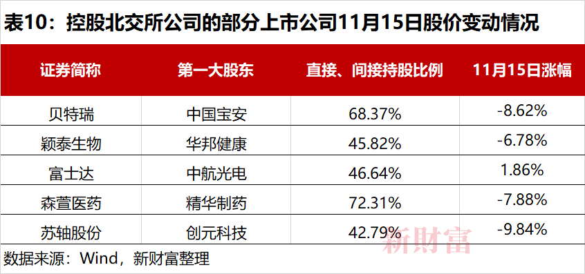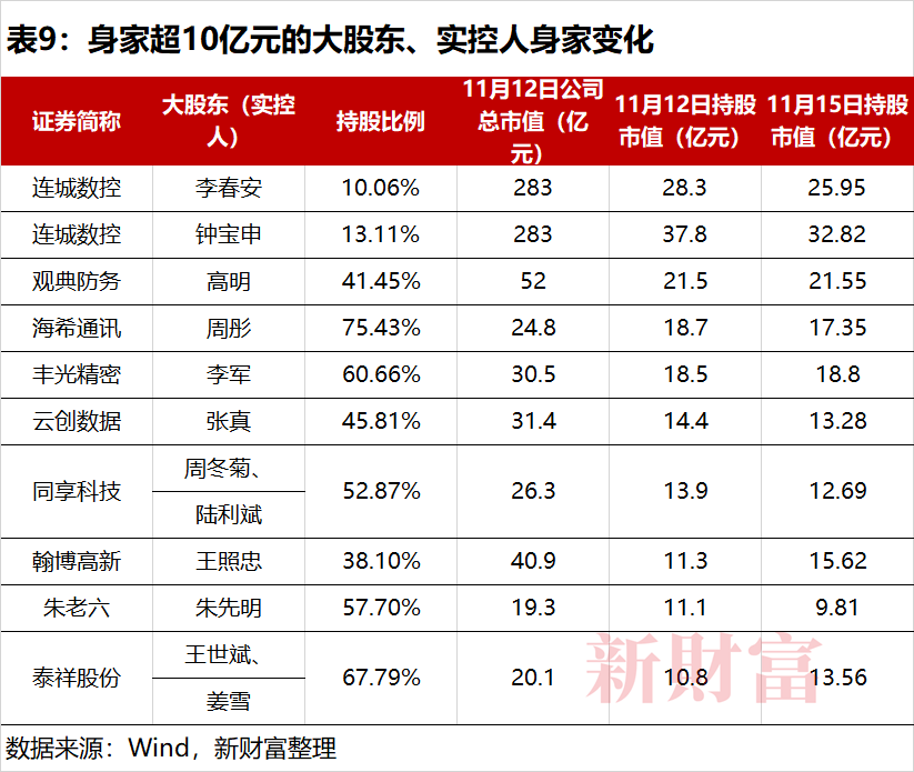 统计显示,截至11月12日,北交所公司的大股东或实际控制人,身家超过10亿元共有10人(家族),由9家公司贡献(表9)。