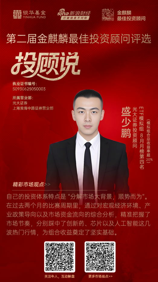 来自光大证券上海淮海中路证券营业部的投资顾问盛少鹏(执业证书编号:S0930625050003)场内ETF模拟配置组合评比中荣获8月月榜第四名,目前模拟组合总收益率超20%。