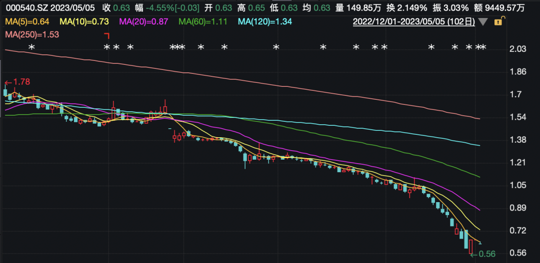 5月5日开盘,*ST 中天股价早盘期间出现短暂拉升,但随后快速下跌,封死跌停板。截至当天收盘,报0.63元/股,总市值跌至44.13亿元。值得注意的是,自4月17日以来,公司收盘价已连续11个交易日低于1元。据证券时报记者测算,即便接下来的9个交易日公司股价连续涨停,也无法在第20个交易日站上1元,由此也提前锁定了“1元退市”。