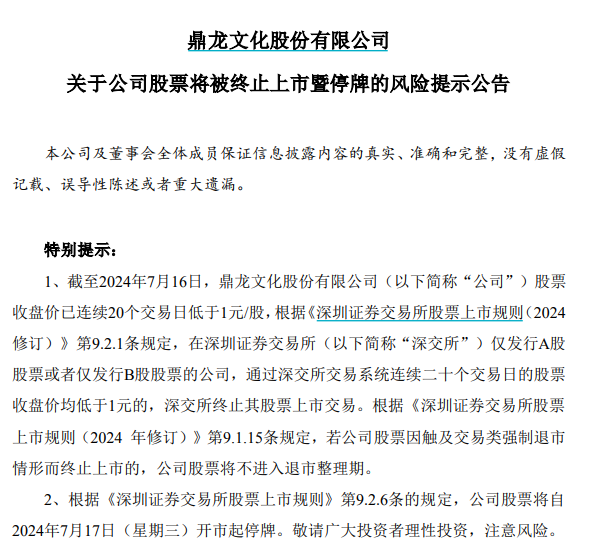 值得注意的是,公告称,根据《深圳证券交易所股票上市规则(2024年修订)》第9.1.15条规定,若公司股票因触及交易类强制退市情形而终止上市的,公司股票将不进入退市整理期。另外,根据《深圳证券交易所股票上市规则》第9.2.6条的规定,公司股票将自2024年7月17日(星期三)开市起停牌。