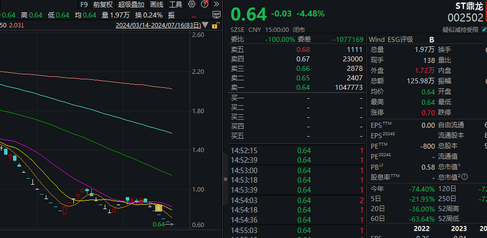 行情数据显示,7月16日ST鼎龙股票再度跌停,收盘报0.64元/股,这是该股收盘价连续第二十个交易日低于1元。公司最新总市值仅5.9亿元,7月以来公司股价累计下跌超过两成,年内公司股价累计下跌超过70%。