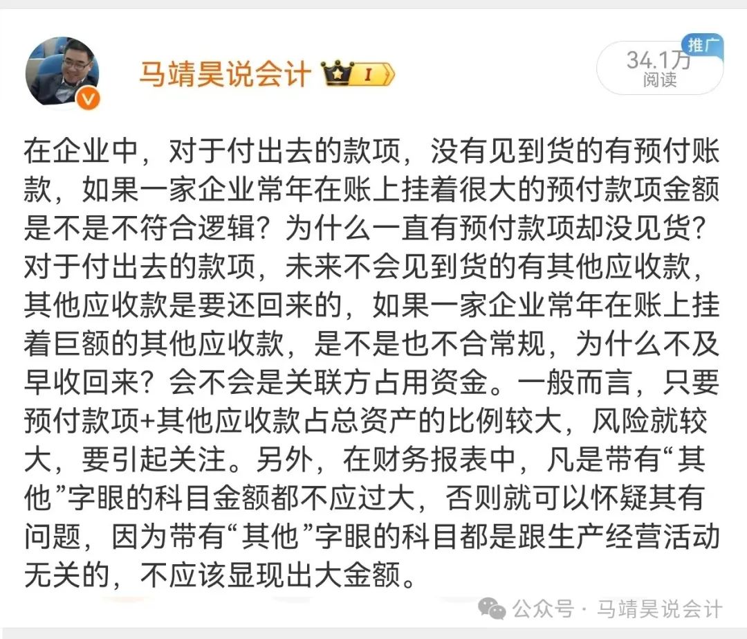 总之,对于上市公司的财务报表中的预付账款、其他应收款以及带有“其他”字眼的科目,需要保持高度关注。如果发现异常情况或风险点,应及时进行深入分析和调查,以确保企业的财务状况和经营成果的真实性和可靠性。