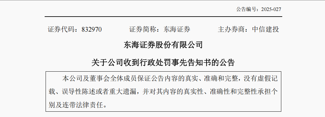 近日,东海证券(832970)发布公告称,因在2015年金洲慈航重大资产重组项目中未勤勉尽责,收到中国证监会《行政处罚事先告知书》,拟被没收业务收入1500万元并罚款4500万元,合计罚没6000万元。这一金额超过公司2024年净利润的2.5倍,不仅创下近年来券商单笔罚没金额新高,更给其停滞三年的A股IPO进程蒙上阴影。