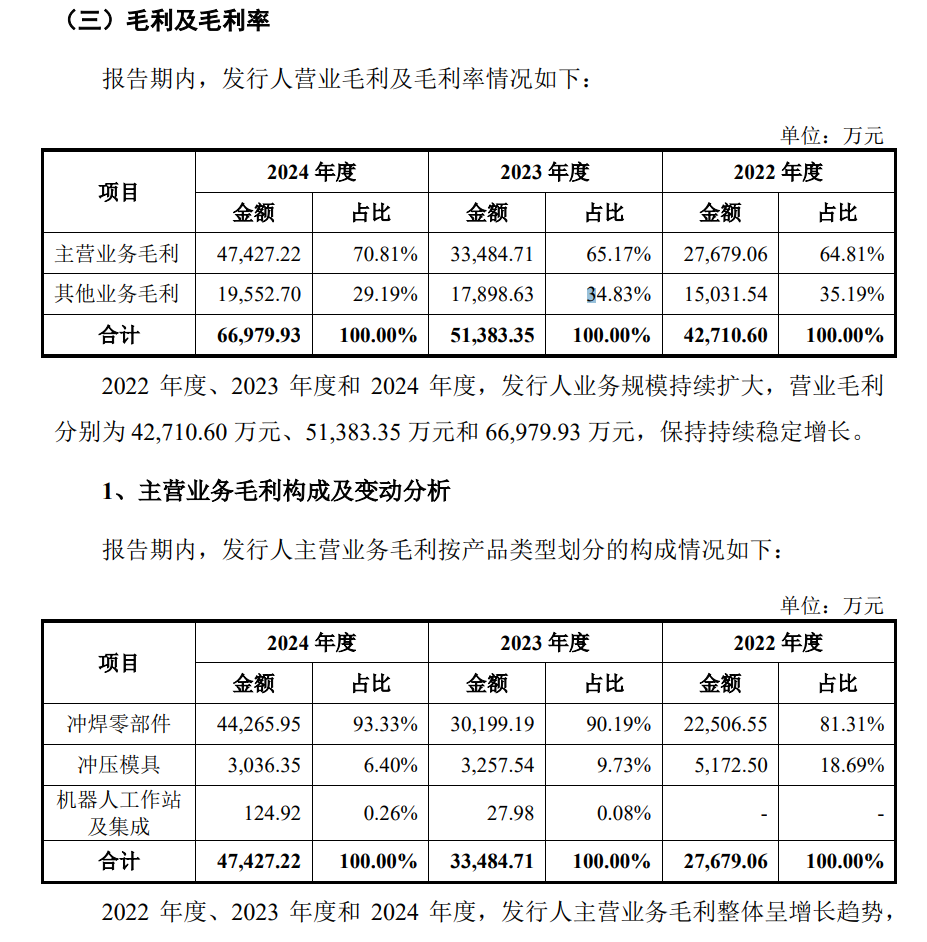 报告期公司业务出现分化。其中,冲焊零部件增长较快,营收分别为17.33亿元、22.39亿元和27.7亿元;冲压模具则逐年萎缩,营收分别为1.77亿元、1.3亿元和1.1亿元;机器人及工作站集成则刚起步,营收分别为0元、360万元和747万元。
