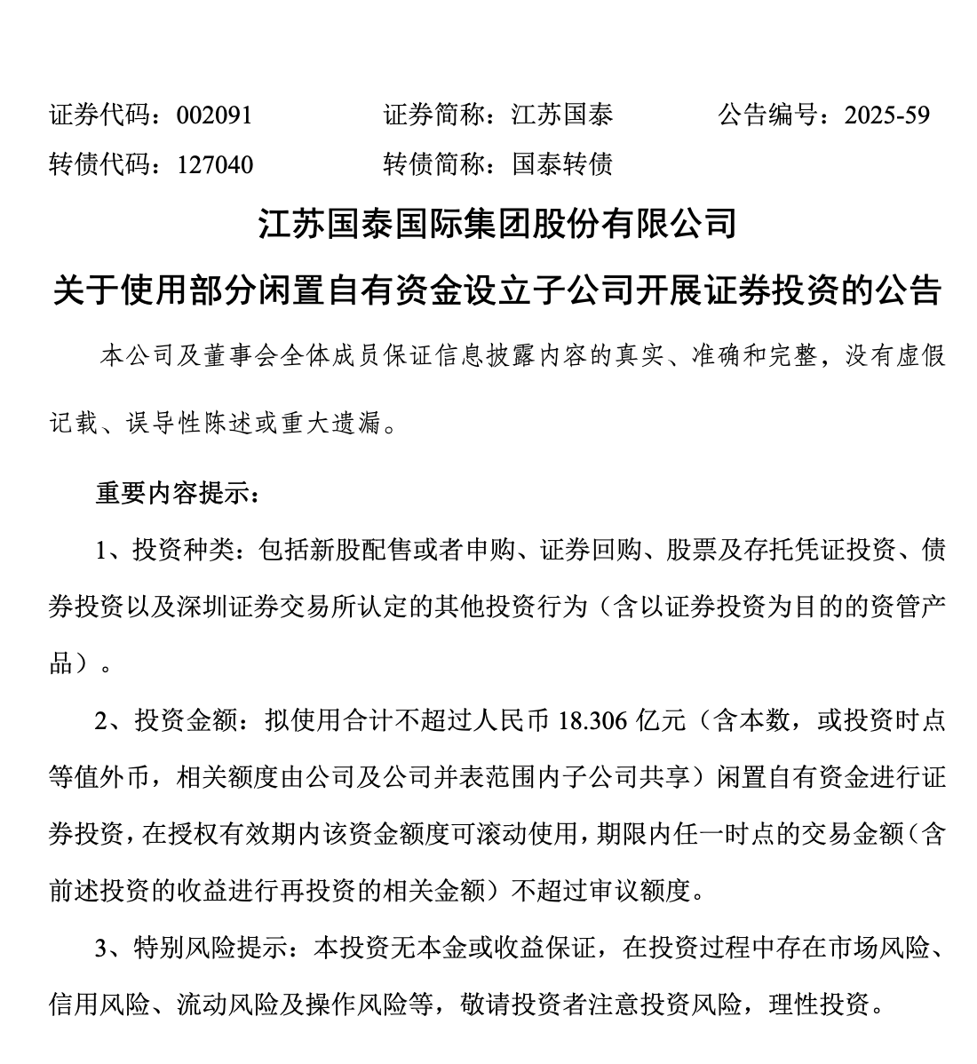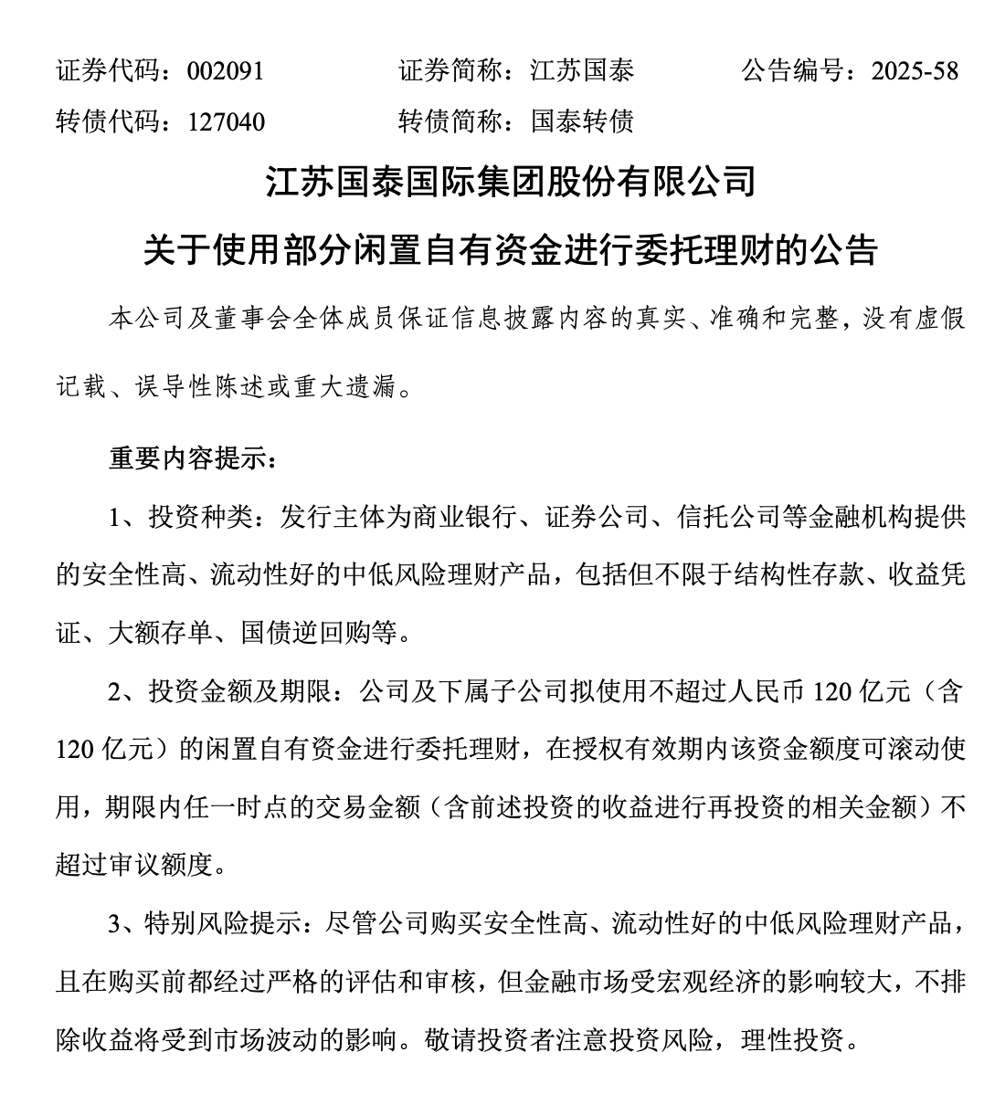 8月22日晚,江苏国泰(002091)一系列公告引发市场争议,这家总市值仅约124亿元的上市公司宣布,拟使用不超过120亿元进行委托理财,同时计划投入不超过18.3亿元进行证券投资,两项合计高达138.3亿元,超过公司当日总市值的11%。
