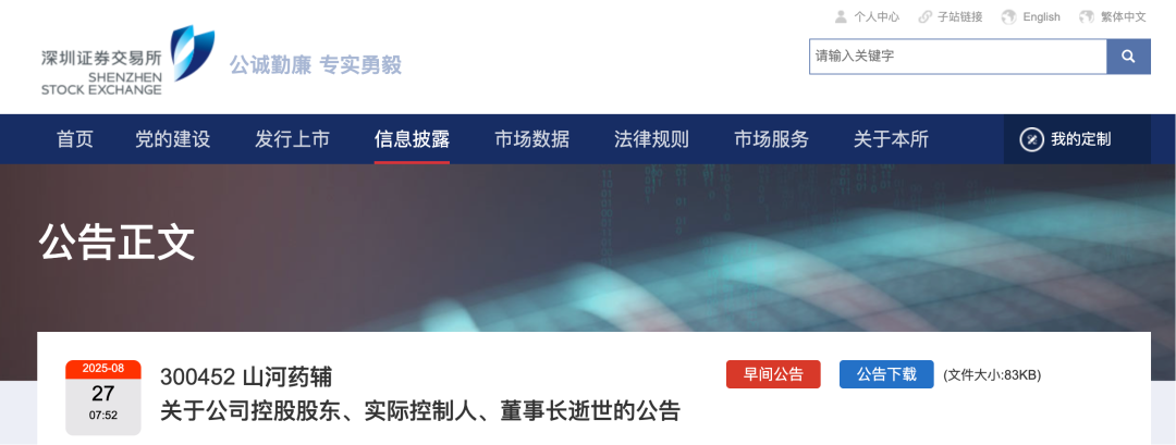 8月27日上午,山河药辅发布公告称,公司控股股东、实际控制人、董事长尹正龙于2025年8月26日下午逝世,享年60岁。