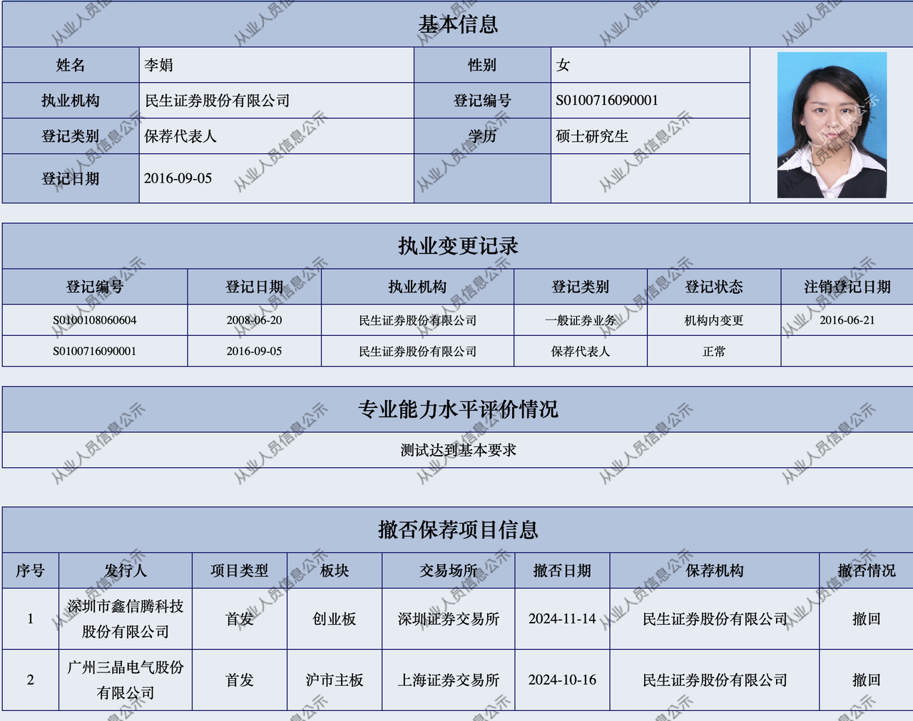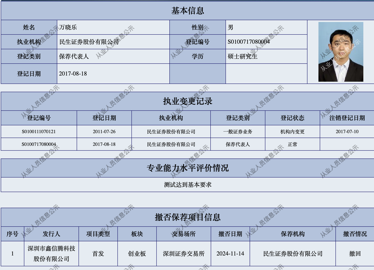 中证协近期更新了“保荐代表人分类名单C(处罚处分类)”,民生证券(现“国联民生证券”,601456)两名保荐人李娟和万晓乐在列。公开信息显示,两人于2025年8月25日被深交所作出自律处罚,而两人共同保荐项目,则是深圳市鑫信腾科技股份有限公司的创业板IPO项目,这一项目于2024年11月14日被撤回。