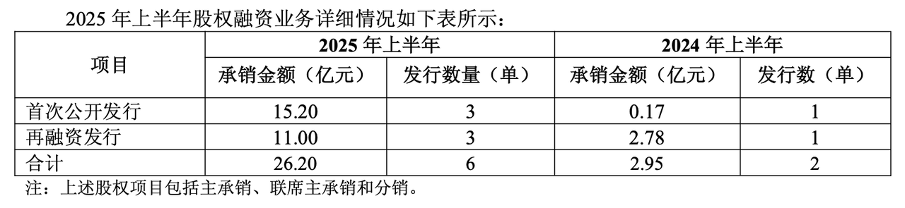 从半年报来看,国联民生证券合并后,投行业务收入明显修复,2025年上半年投行业务营业收入约5.44亿元,同比增加214.94%,投行毛利率为6.49%,同比减少1.47%。股权融资落地6单,包括3单IPO和3单再融资,承销金额合计26.2亿元,均位于行业前十。