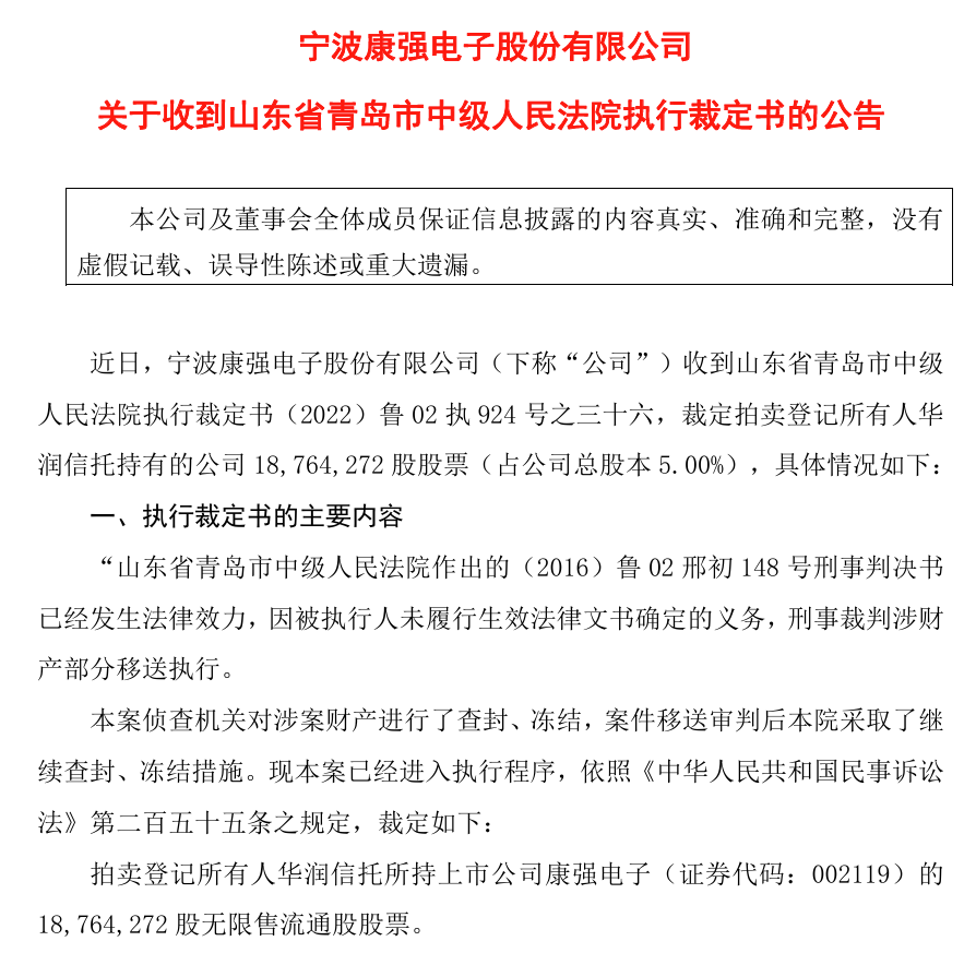 9月11日晚间,康强电子(002119)发布公告称,公司已收到山东省青岛市中级人民法院(下称"青岛中院")出具的执行裁定书,裁定对华润深国投信托有限公司(下称"华润信托")旗下"泽熙6期单一资金信托计划"持有的1876.4万股公司股份进行司法拍卖。