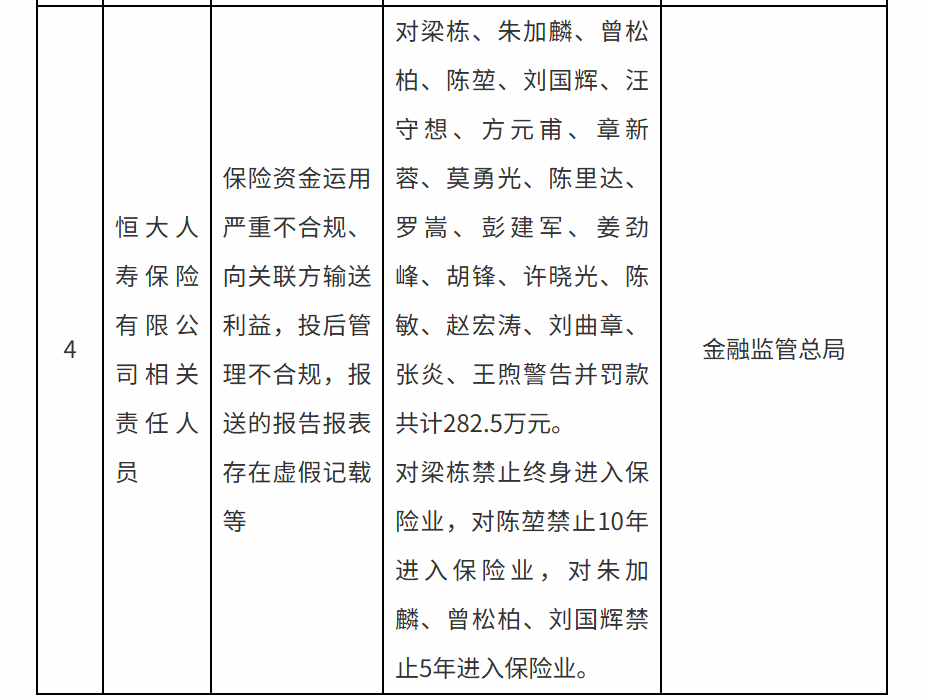 根据国家金融监督管理总局处罚决定,恒大人寿存在保险资金运用严重不合规问题。据此,监管部门对梁栋、朱加麟、曾松柏、陈堃、刘国辉等20人给予警告,合计罚款283万元;同时对5名核心人员实施禁业,包括恒大人寿两任前董事长梁栋、朱加麟,原总经理曾松柏,原副总经理陈堃等,禁业期限从5年至终身不等。